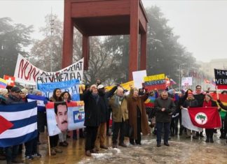 Околу 100 луѓе се собраа деонес в Женева, во знак на протест поради санкциите на САД против Венецуела и признавањето на претседателот на Националниот парламент, Хуан Гуаидо, како привремен претседател на таа земја, објави Агенцијата Анадолу (АА).