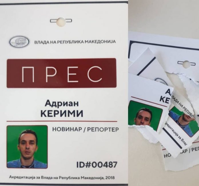 Адриан Керими новинар од Алсат-М, ја искина новинарската легитимација од Владата на Република Македонија. Причина за тоа е дека таа не била напишана на албански јазик.