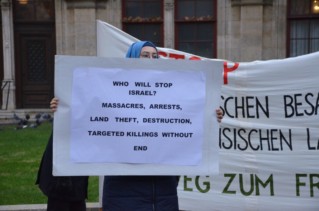 Демонстрантите носеле транспаренти со натписите “Стоп за израелската окупација на палестинската територија“ Палестина се уништува “и” Кој ќе го сопре Израел во правењето на злосторства“