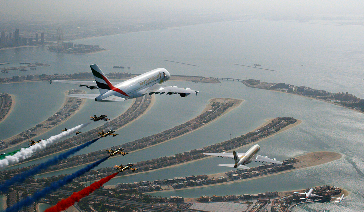 Дубаи: Авиони на Emirates, Etihad, flydubai, Air Arabia и Al Fursan денес на 2 декември се вивнаа на небото за да го прослават 47-тиот национален ден на Обединетите Арапски Емирати, како и да го одбележат наследството и вредностите на Шеик Зајед, татко-основач на ОАЕ.