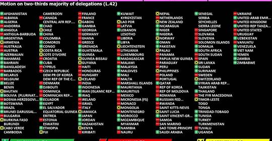 За резолуцијата, која силно ја поддржаа САД и Израел, беше потребно двотретинско мнозинство за да помине гласањето во Собранието. На крајот гласањето не помина, бидејќи 87 држави гласаа за, 57 против, додека 33 беа воздржани.