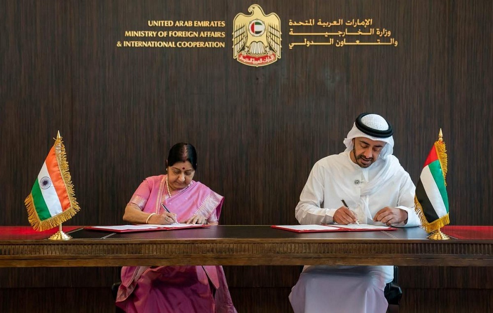 Спогодбата беше потпишана во текот на посетата на Обединетите Арапски Емирати на министерот за надворешни работи на Индија, Сушма Сварај. Индискиот министер Сварај и министерот за надворешни работи и меѓународни односи ОАЕ, шеикот Абдула бин Зајед ал-Нахјан, го водеа 12-тиот заеднички самит ОАЕ-Индија, што се одржа во седиштето на министерството во Абу Даби.