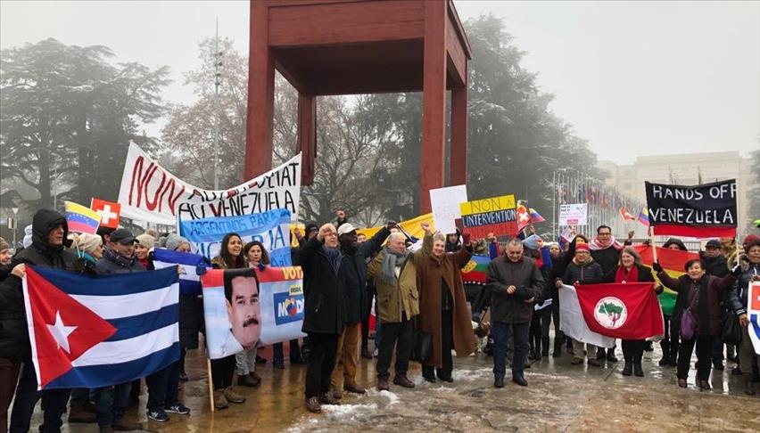 Околу 100 луѓе се собраа деонес в Женева, во знак на протест поради санкциите на САД против Венецуела и признавањето на претседателот на Националниот парламент, Хуан Гуаидо, како привремен претседател на таа земја, објави Агенцијата Анадолу (АА).