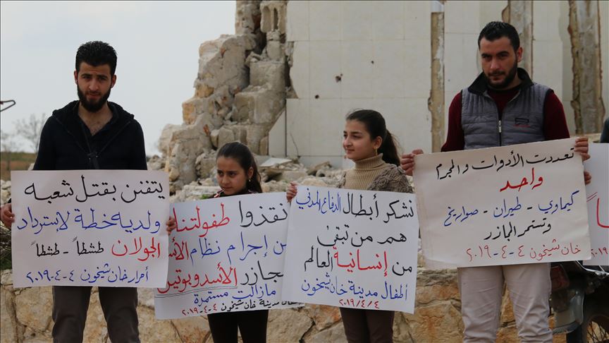 Цивилите кои денес живеат во Кан Шејхун се присетија на жртвите од нападот кој се случи пред две години, а во кој загинаа повеќе од 100 лица. Носеа и транспаренти на кои беа напишани пораки на арапски и англиски јазик: „Саринот нѐ убива, а цивилната заштита ги спасува нашите животи“, „Поминаа две години од нападот со хемиско оружје, а нашите деца и денес се изложени на напади“.