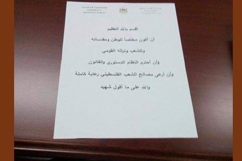 Точниот текст на заклетвата треба да биде: “Се колнам да бидам лојален на татковината и нејзините светости, кон народот и неговото национално наследство, да го почитувам уставниот поредок и законот и да се погрижам за интересите на палестинскиот народ “.