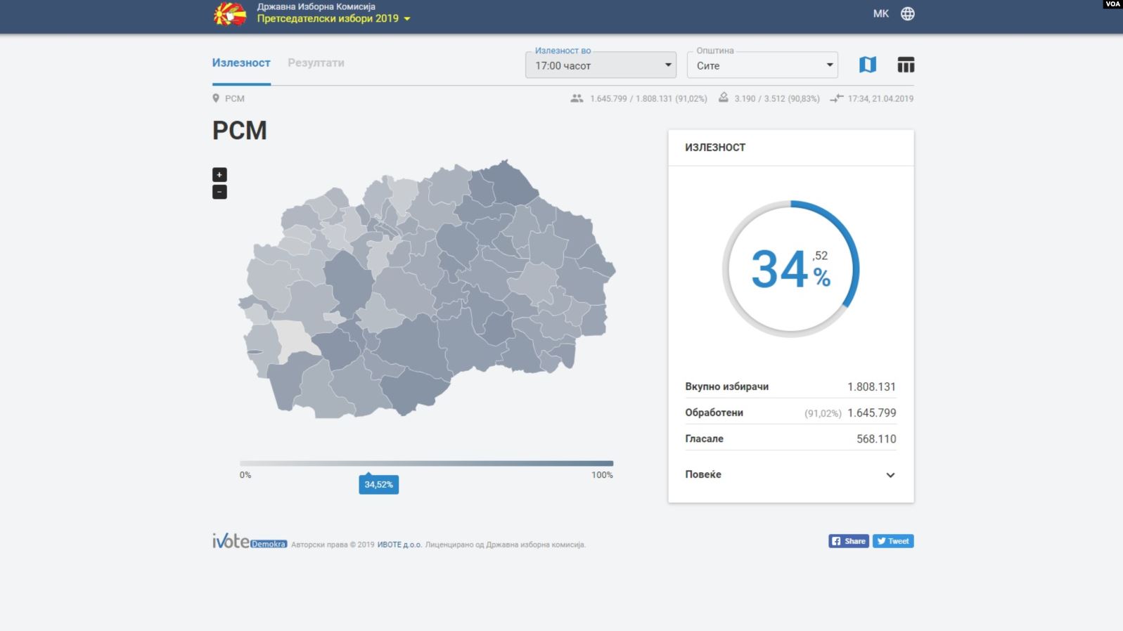 (Дубаи – Портал) – Според официјалните податоци на Државната изборна комисија (ДИК) одзивот на гласачите до 17 часот е 34,52 % од обработени 91 отсто од избирачките места. Досега од вкупно запишаните 1.808.131 гласачи своето право на глас го искористиле 568.110 граѓани на 3.480 гласачки места.