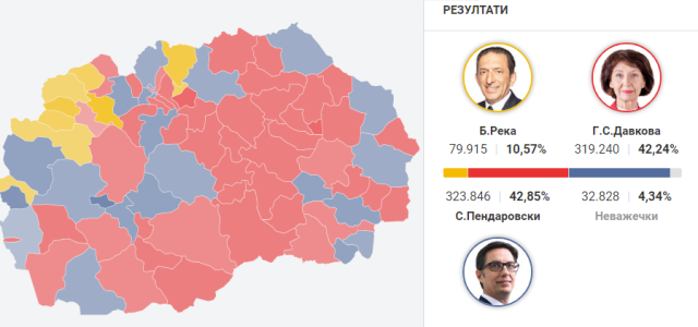 За Блерим Река гласале 79.915 граѓани или 10,57%, за Гордана Силјановска – Давкова 319.240 граѓани или 42,24% и за Стево Пендаровски – 323.846 граѓани или 42,85%. На изборите имало 32.828 неважечки гласачки ливчиња.