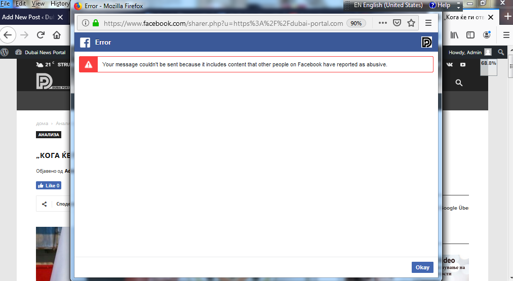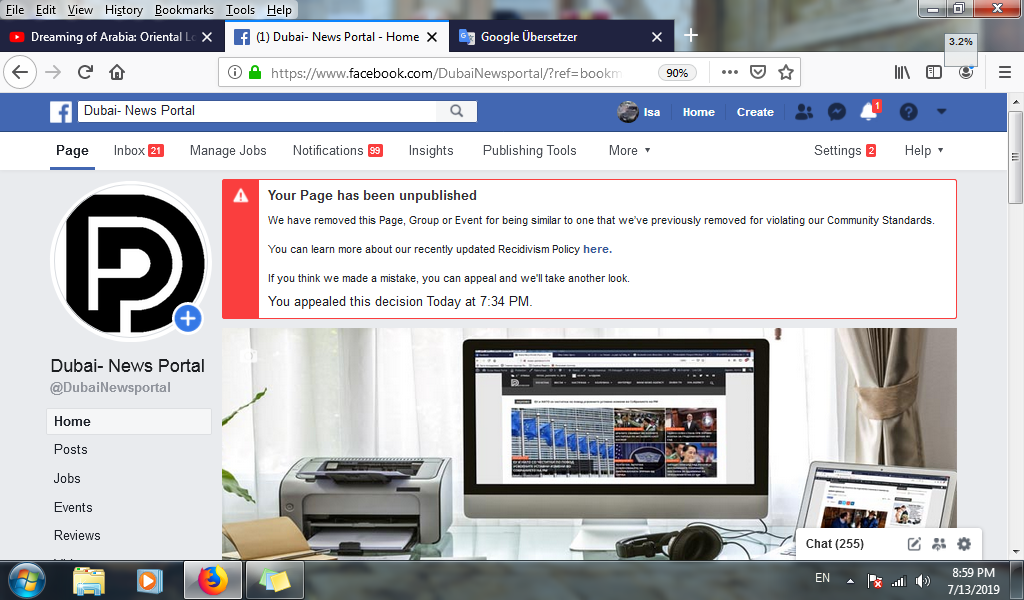 Почитувани, посетители и поддржувачи на Dubai Portal (Dubai-portal.com.mk),од 13.07.2019 год, од засега “не познати “причини од страна на админстрацијата на фејсбук, симната е односно блокирана фејсбук страната на DubaiNewsportal.и истата повеќе не е достапна за јавноста.