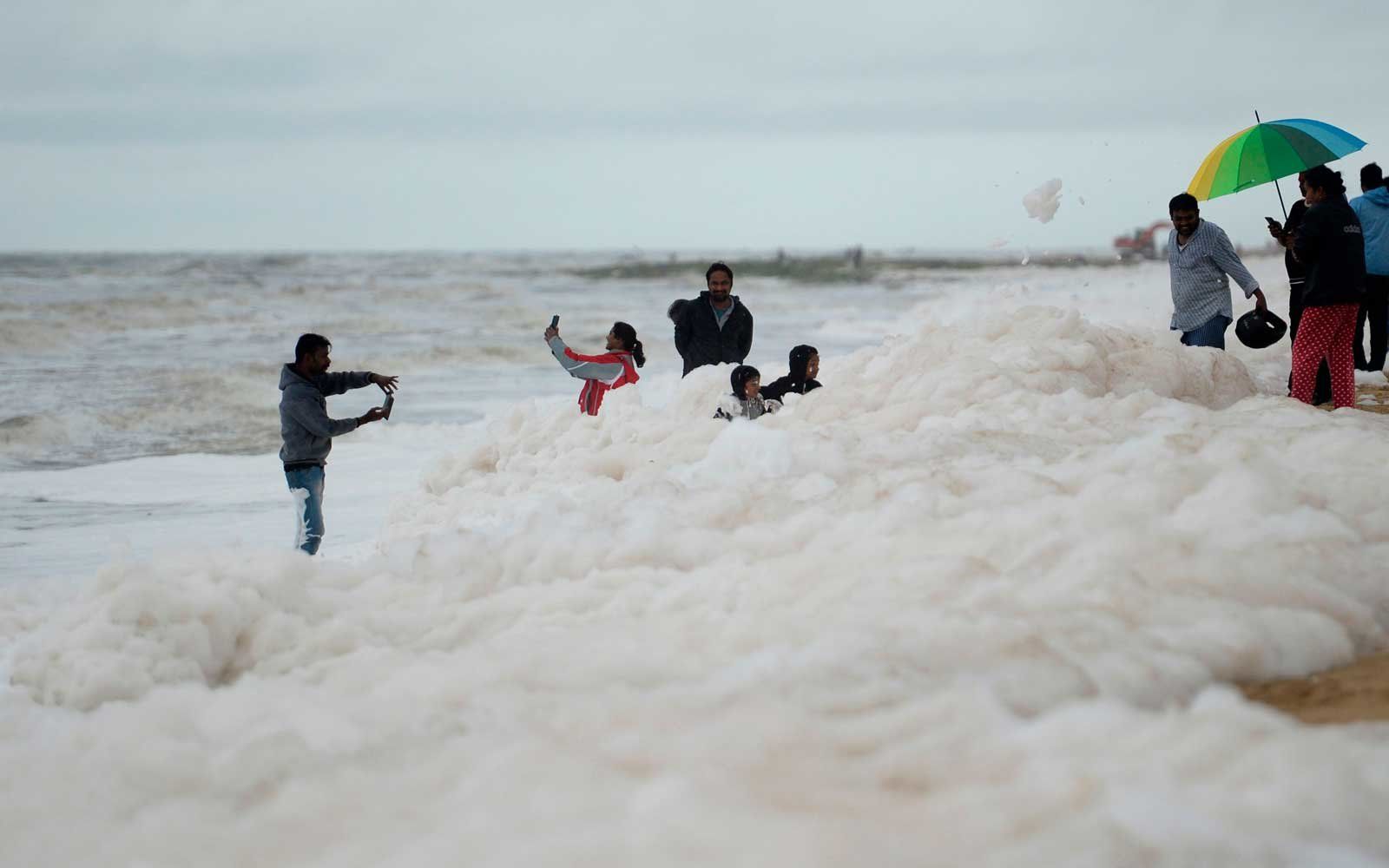 Во текот на викендот и почетокот на неделата, токсична бела пена ја поплави плажата Марина, една од најпознатите индиски плажи во Ченаи(Chennai)