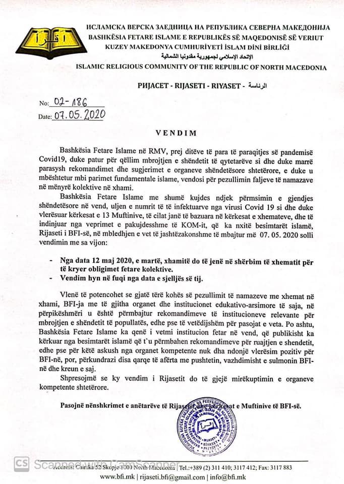 „Исламската верска заедница во РС Македонија од првите денови од воведувањето на пандемијата Ковид19, со цел да го заштити здравјето на граѓаните и земајќи ги предвид препораките и предлозите на државните здравствени тела, и потпирајќи се на фундаментални исламски принципи, одлучи да ги суспендира колективните молитви во џамиите.
