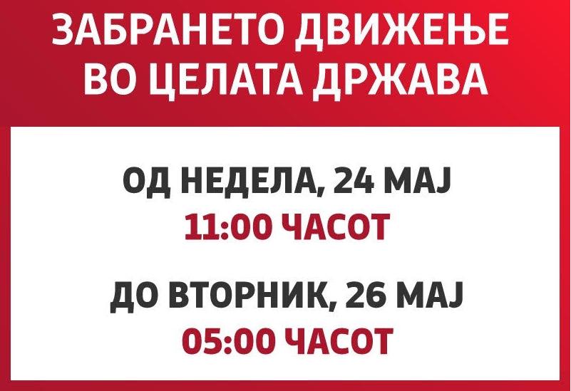 Се забранува движењето на сите граѓани на целата територија на државата почнувајќи од недела, 24 мај, во 11:00 часот до вторник, 26 мај, до 05 часот.