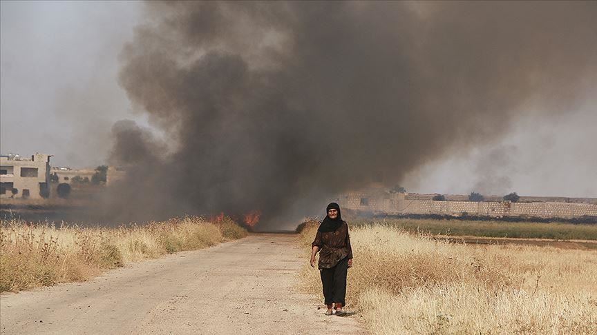 Според информациите до кои дојде новинарот на Агенција Анадолија (АА), режимските сили стационирани североисточно од Идлиб со топови и минофрлачи ги гаѓаат засадените полиња во местото Тефтеназ и на тој начин ги палат посевите на локалното население.