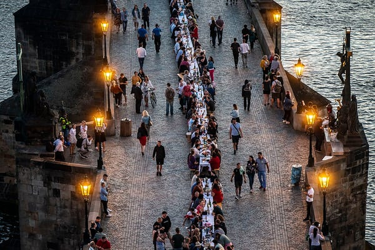 Околу илјада гости седеа на 500 метри долгата маса поставена на Карлов мост, споделувајќи храна и пијачки што ги донеле од дома, со посебен нагласок на споделувањето со ближниот до себе.