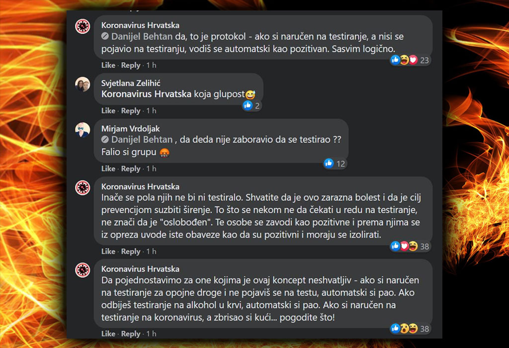 Само што прочитав ужасна вест, и ако е точна, нашите здравствени власти ни кажаа на сите нас дека не ни најмалку не ги интересираат фактите. Притоа, тие цело време велат дека се експерти и се повикуваат на наука. Се надевам дека разбирате дека ова е некомпатибилно. Како што можете да видите на сликата во Фејсбук (Facebook) групата Коронавирус Хрватска (Croatia), тие напишаа дека протокол е, лице кое се пријавило за тестирање, а не се тестира, автоматски се прогласува ПЦР (PCR) позитивно.