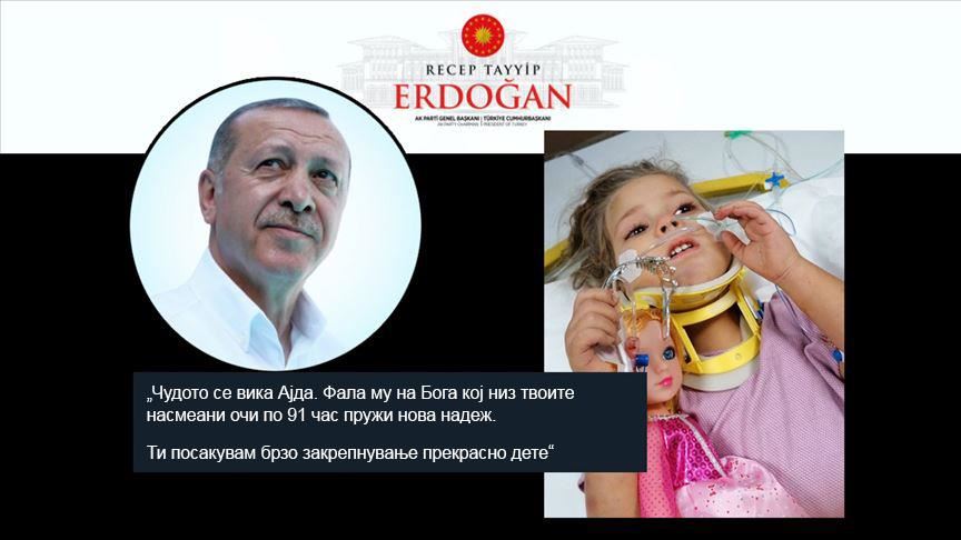 „Чудото се вика Ајда. Фала му на Бога кој низ твоите насмеани очи по 91 час пружи нова надеж. Ти посакувам брзо закрепнување прекрасно дете“, напиша Ердоган.