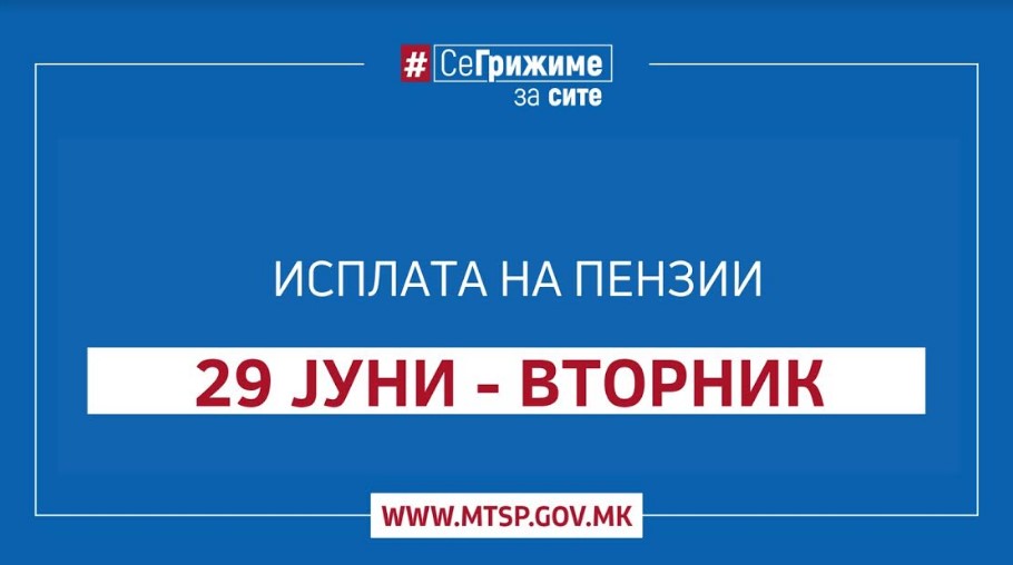 Министерството за труд и социјална политика известува дека од утре 29.06.2021 година, (вторник) започнува етапната исплата на јунските пензии. Пензиите ќе бидат исплатени предвреме и етапно.