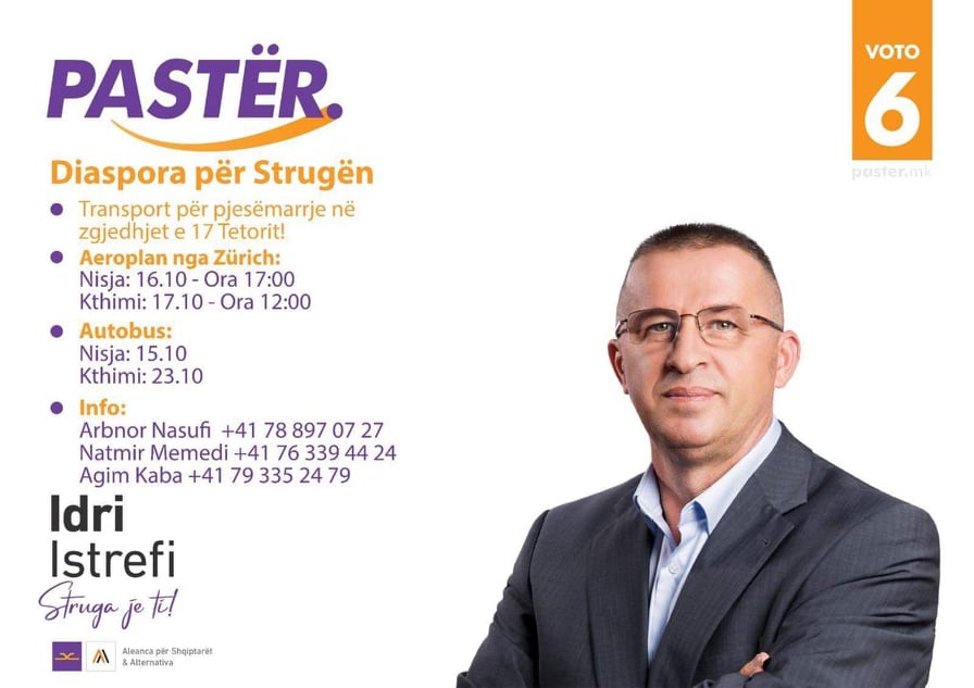 По повод престојните локални избори кои ќе се одржат на 17-ти Октомври, здружението „Дијаспора за Струга“ и коалицијата Алијанса за Албанците/Алтернатива ги известува сите симпатизери, членови и граѓани кои ја подржуваат ова партија и нејзината политичка програма, дека организира превоз од Швајцарија во две насоки, со следниов распоред: