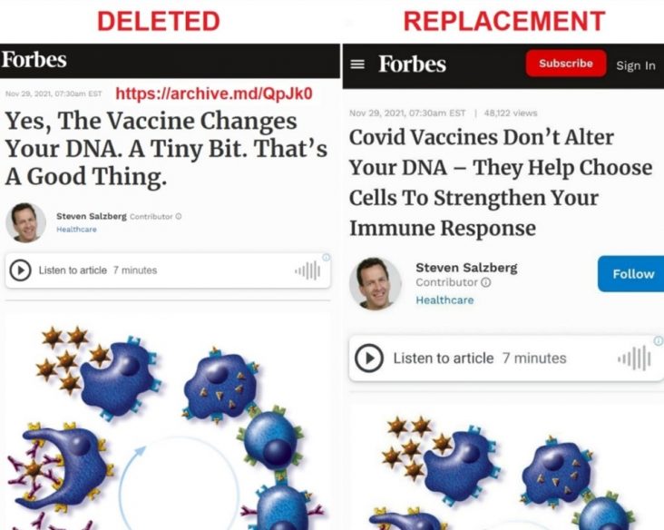 Угледниот финансиски магазин Форбс еднаш објави статија со наслов: „Да, вакцините ја менуваат вашата ДНК. Само малку. Но, тоа е добро“. Откако написот се рашири на социјалните мрежи, како доказ за тоа што го зборуваме со години, Форбс брзо ја измени статијата и го смени насловот, а сега пишува: „Вакцините против СОВИД не ја менуваат вашата ДНК – тие помагаат да се изберат клетки кои го зајакнуваат вашиот имунолошки одговор“. Овој новинар очигледно стави „погрешен наслов“ и веднаш се интервенираше. Интересно е да се гледа како се губат во нивните лаги.