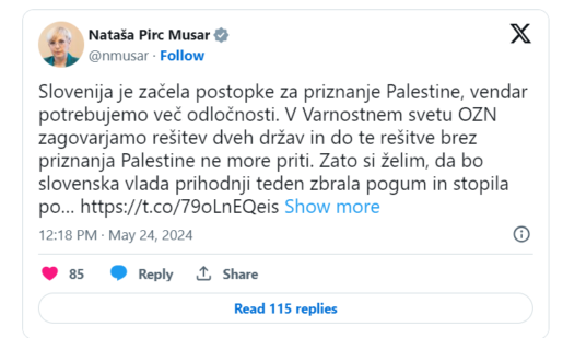 Словенија покрена процедури за признавање на Палестина, но ни треба поголема одлучност. Во Советот за безбедност на ОН ние се залагаме за решение со две држави и тоа решение не може да се постигне без признавање на Палестина. Затоа се надевам дека следната недела словенечката влада ќе собере храброст и ќе тргне по патот на Норвешка, Шпанија и Ирска, рече таа.