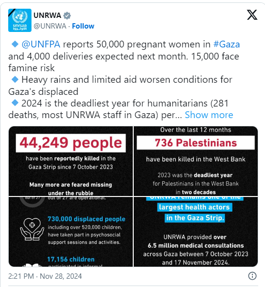 Исто така, беше наведено дека 2024 година беше „најсмртоносната година за хуманитарните работници“ со 281 смртен случај ширум светот, повеќето од нив вработени во UNRWA во Газа.